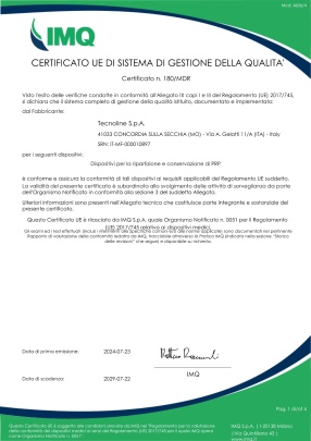 Tecnoline Spa's Quality System is certified according to ISO 13485:2016. Tecnoline manufactures CE0051-marked medical devices and medical devices for third parties. Working environments are controlled and ISO 8 certified.